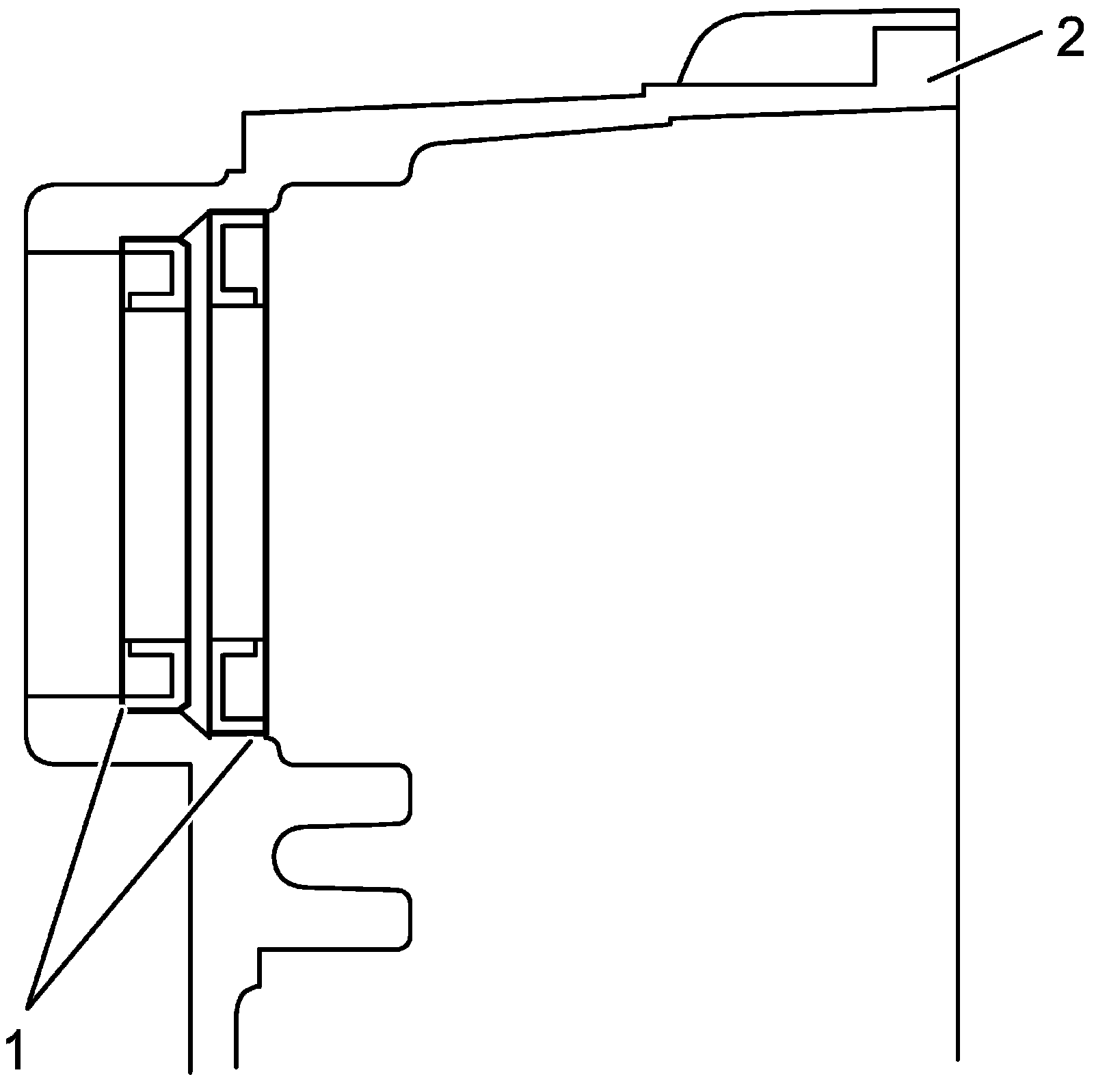 9) Use chisel (1) to break the thinnest portion of bearing inner race (2) and remove bearing.