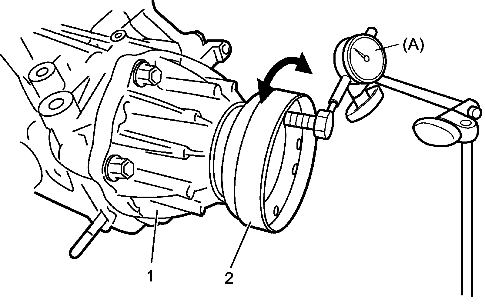 f) Use dial gauge to measure play of flange (2) rotative direction. If check result is not specified, change distribution of reduction driven gear right and left shims installed on transfer left case and transfer right case in Step b) and measure its play again.