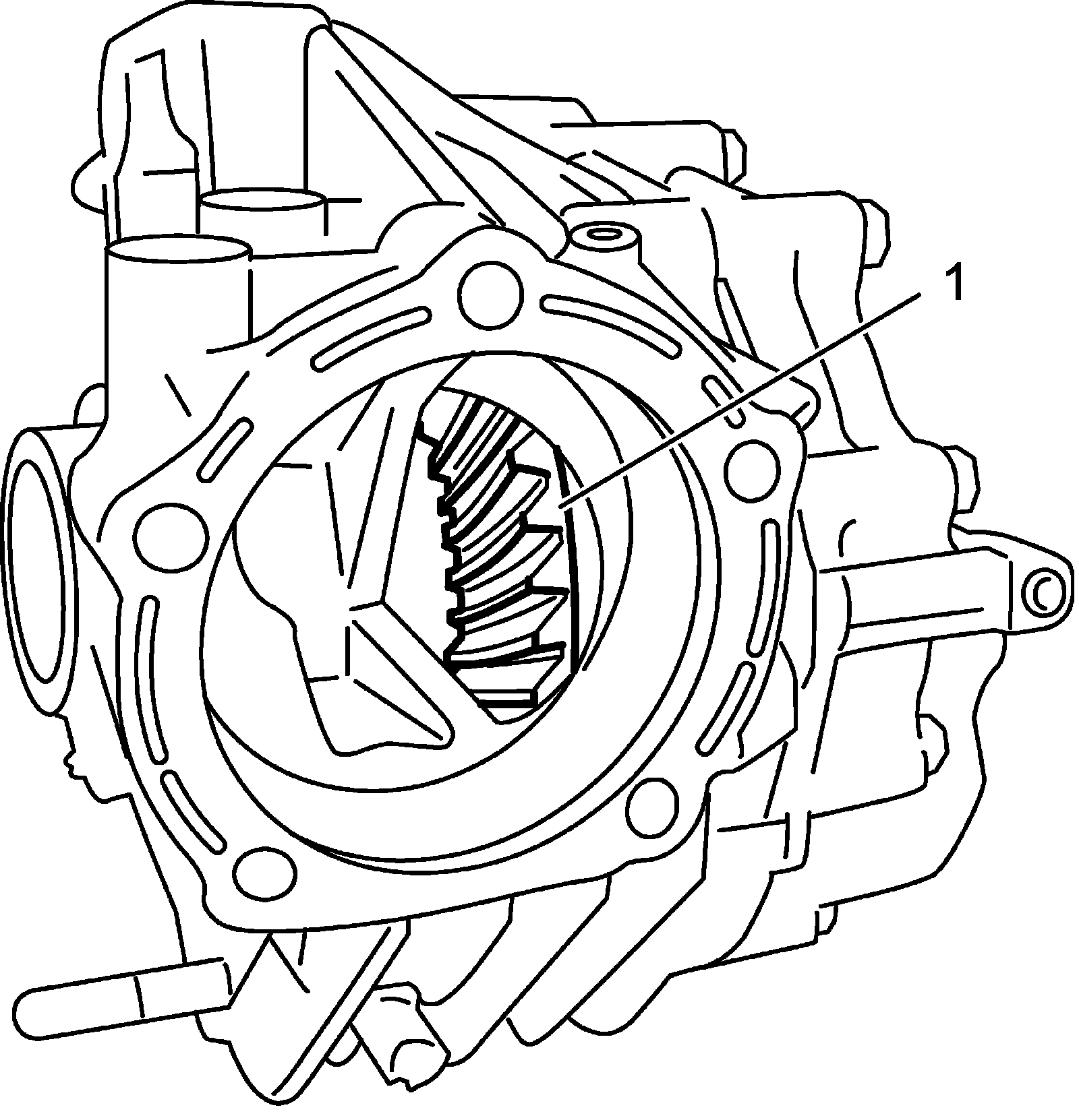 g) Remove transfer output retainer and inspect teeth contact of bevel gear (1).