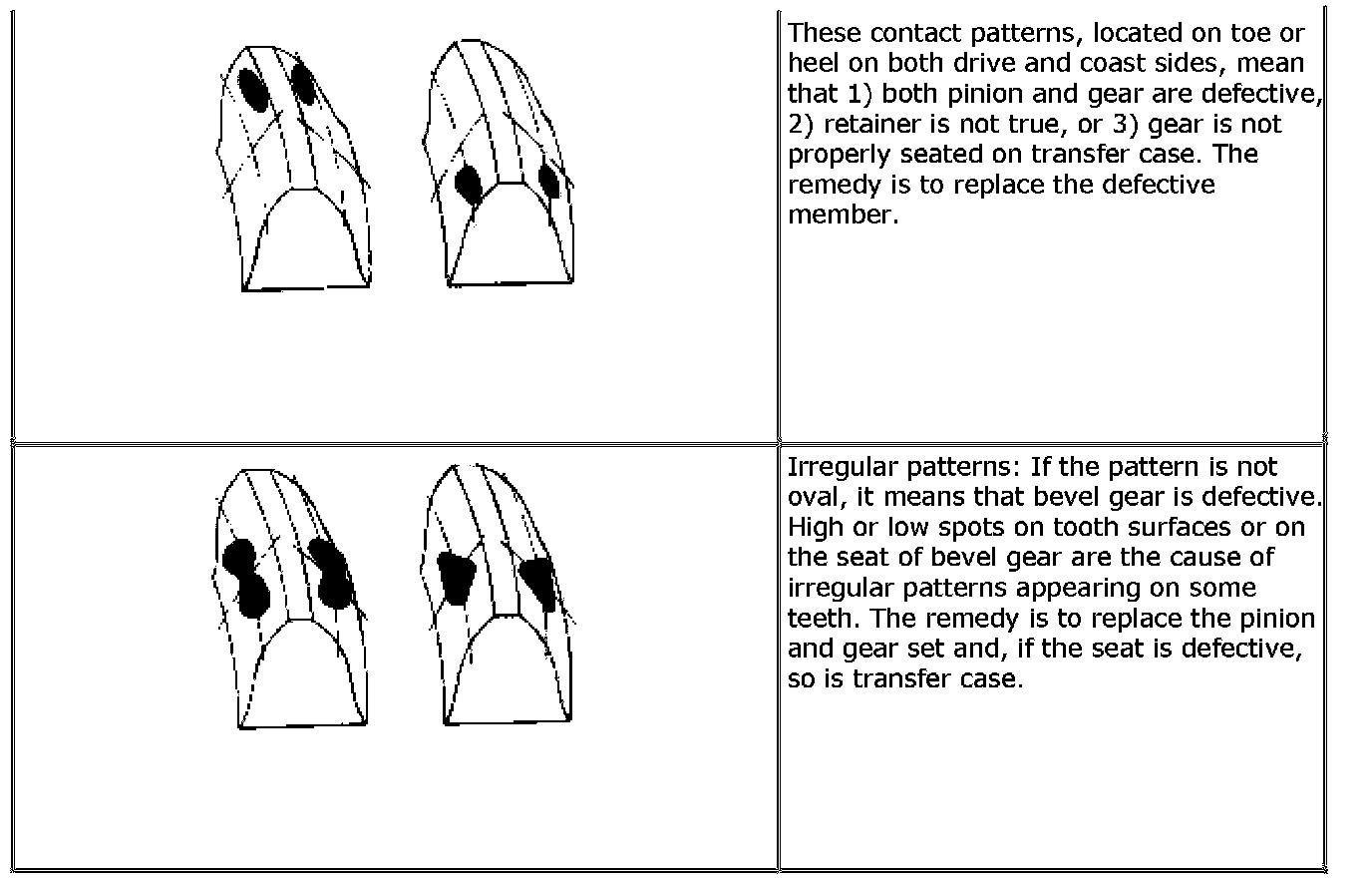 If correct tooth contact is not provided even when they are adjusted properly, however, there may be an abnormal condition in warm tooth, transfer case or retainer. Check each component and replace if necessary.