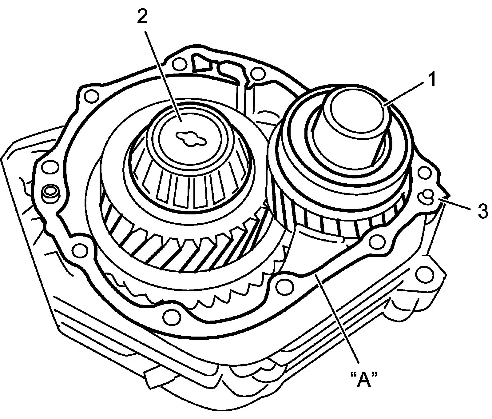 5) Remove reduction drive gear assembly (1) and reduction driven gear assembly (2) from transfer left case (3).