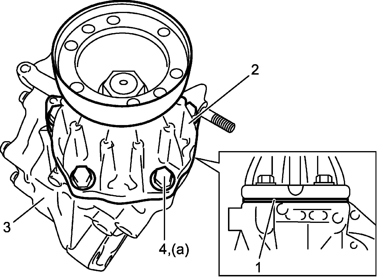 18) Install shim (1) selected in Transfer Output Retainer Assembly Disassembly and Reassembly and transfer output retainer (2) to transfer case (3) and tighten retainer bolts (4) to specified torque.