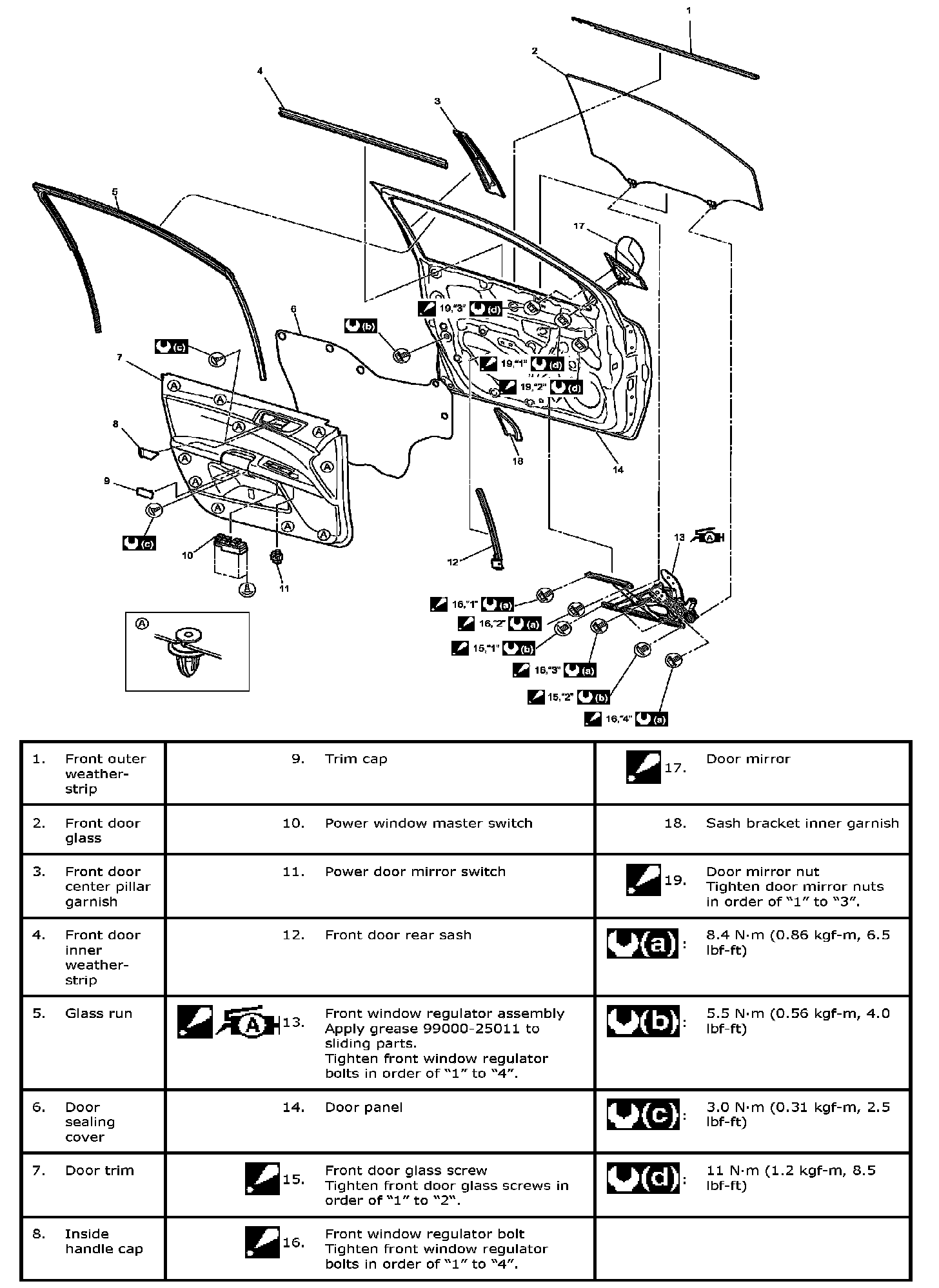 Front window regulator bolt (a): 8.4 N.m (0.86 kg-m, 6.5 lbf-ft)