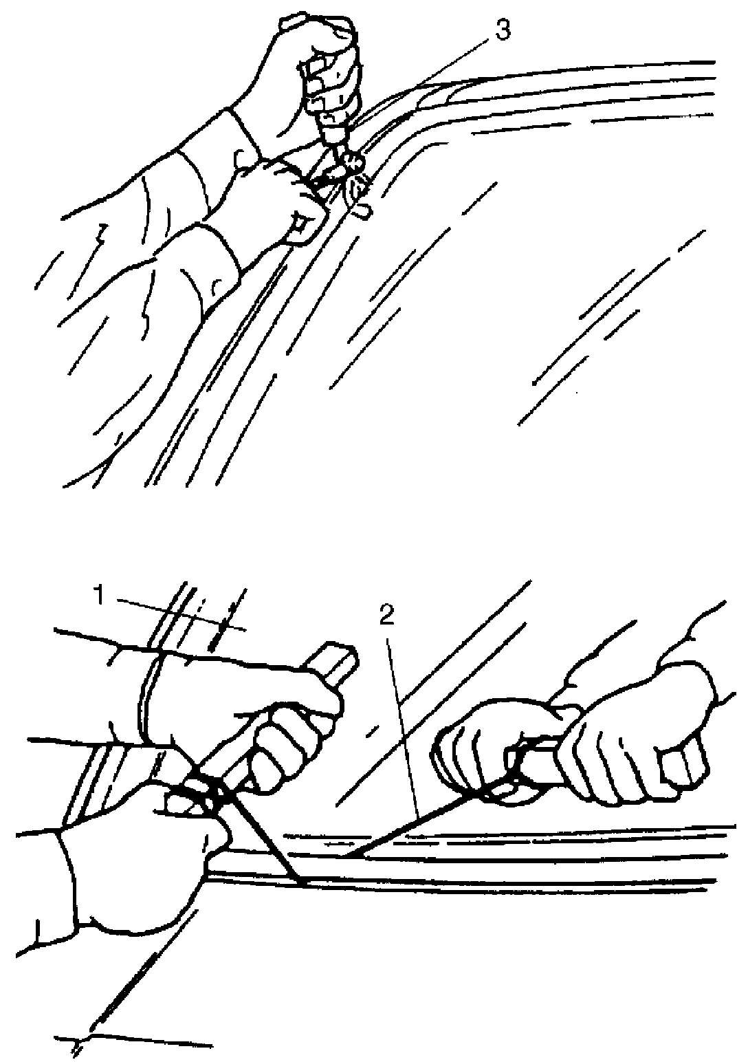 11. Cut all adhesives of windshield (1) with piano string (2).