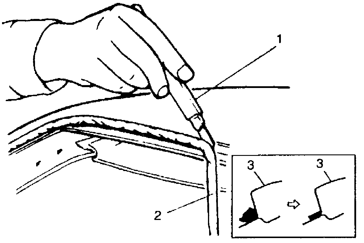 12. Using knife (1), smoothen adhesive remaining (2) on body side (3) and thickness of adhesive should be 1 to 2 mm (0.04 to 0.08 in.).