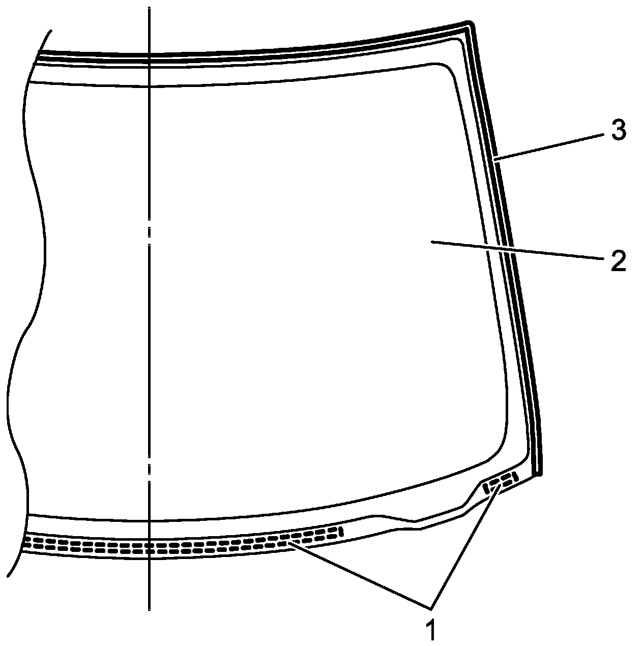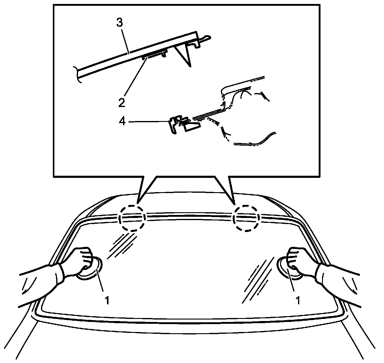 5. Apply primer onto windshield molding mounting area on windshield (2) and install new windshield molding (3) to windshield.
