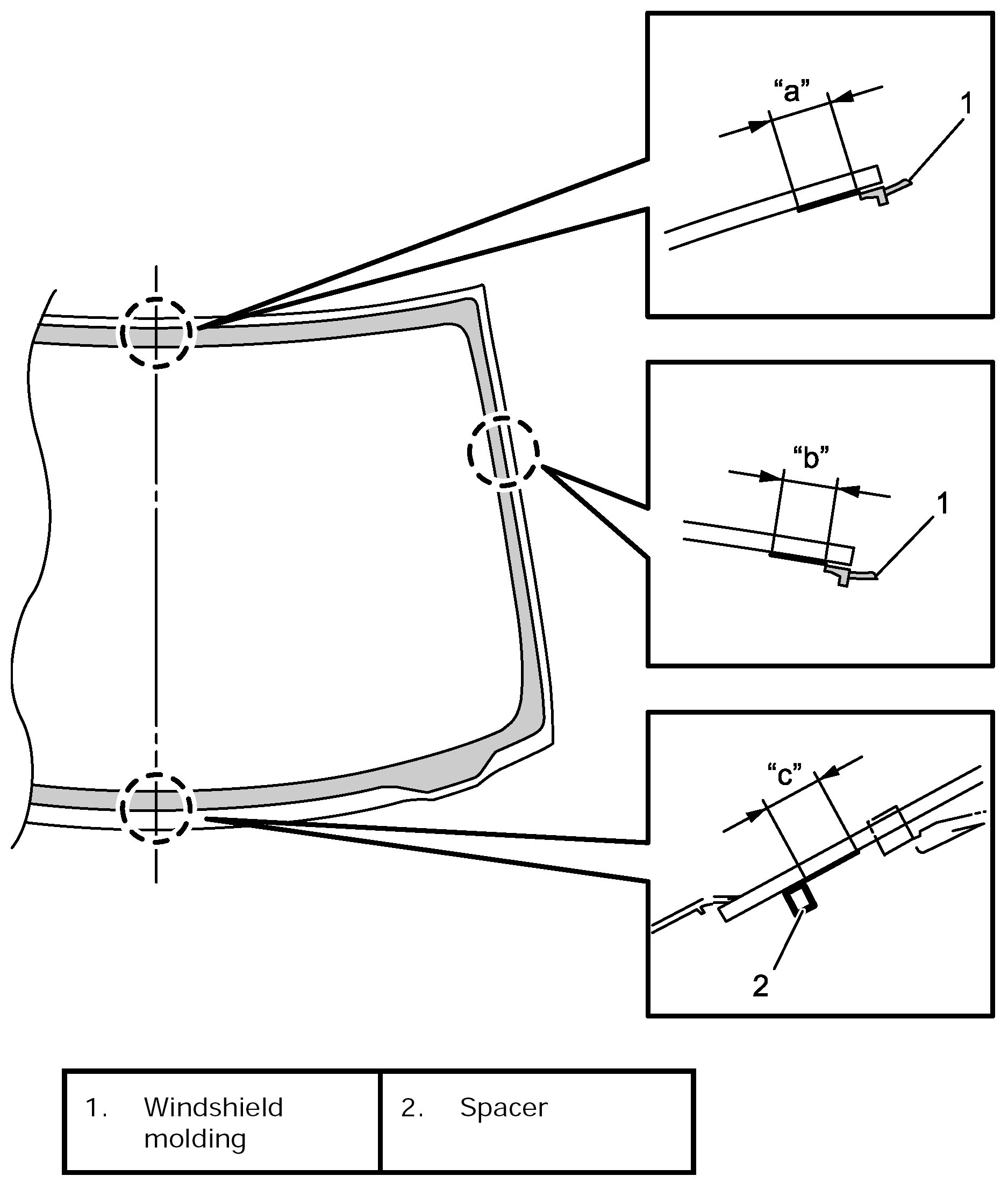 2. Align glass upper fasteners (male) on windshield (1) with glass upper fasteners (female) and temporarily position the windshield (1) on body so that clearances at right and left sides of it and body are equal.