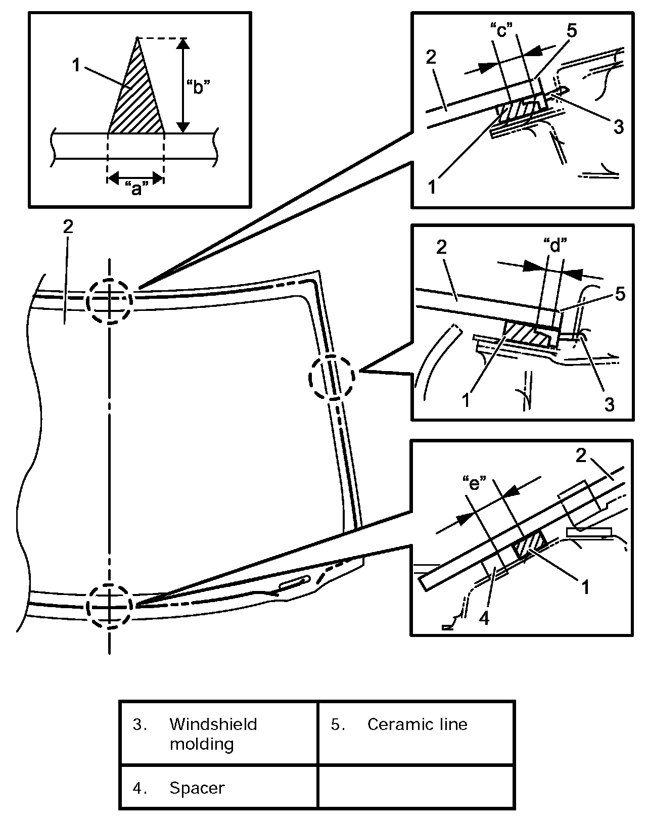 NOTE: If windshield is to be reused, be careful to remove adhesive (1) not to damage primer application surface (2).