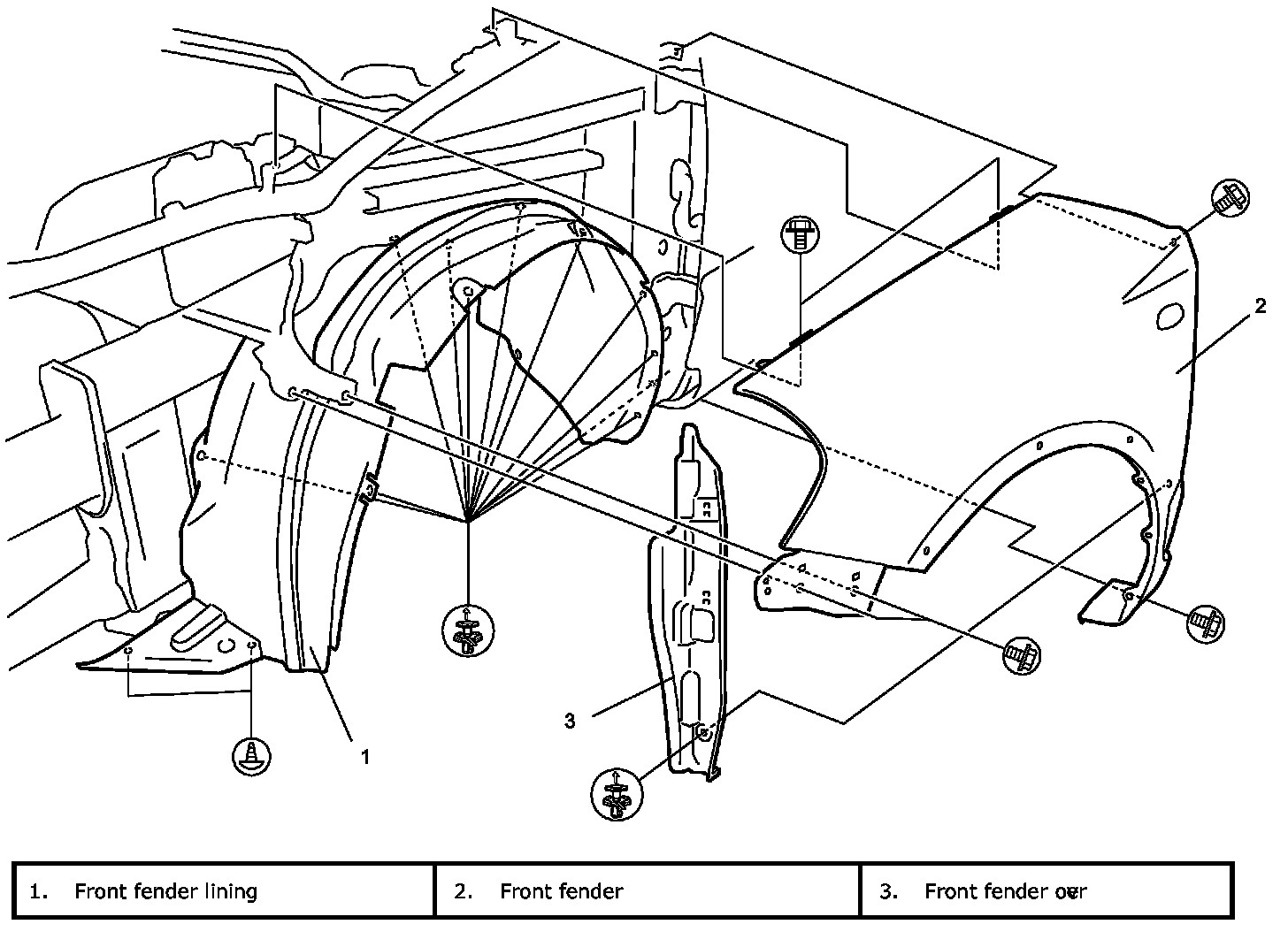 1. Remove side sill splash guard and front fender splash guard (if equipped) referring to Splash Guard Removal and Installation (If Equipped).