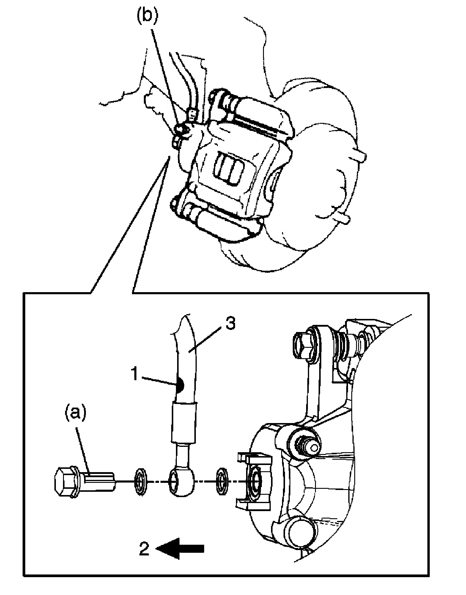 2) Remove brake flexible hose joint bolt (1) from caliper (2). As this will allow fluid to flow out of hose (3), have a container ready beforehand.