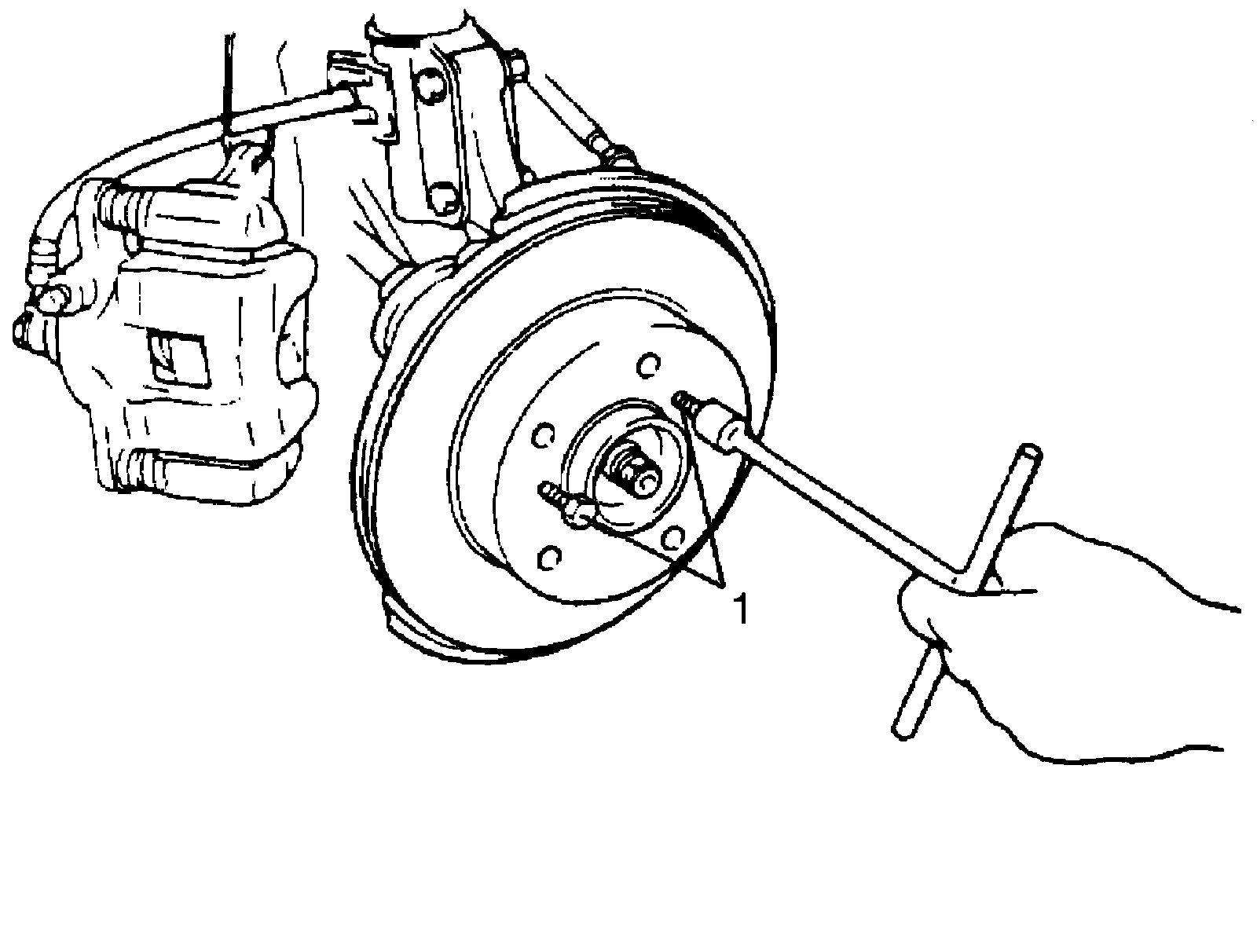 Hang removed caliper with a wire hook or the like so as to prevent brake hose from bending and twisting excessively or being pulled.