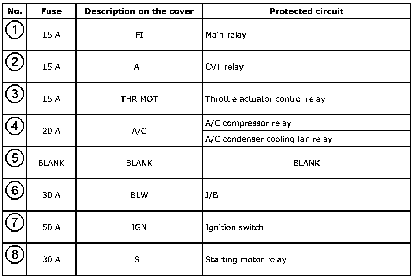 Fuse Box No.1 Application Table Fuse 1-Fuse 8: