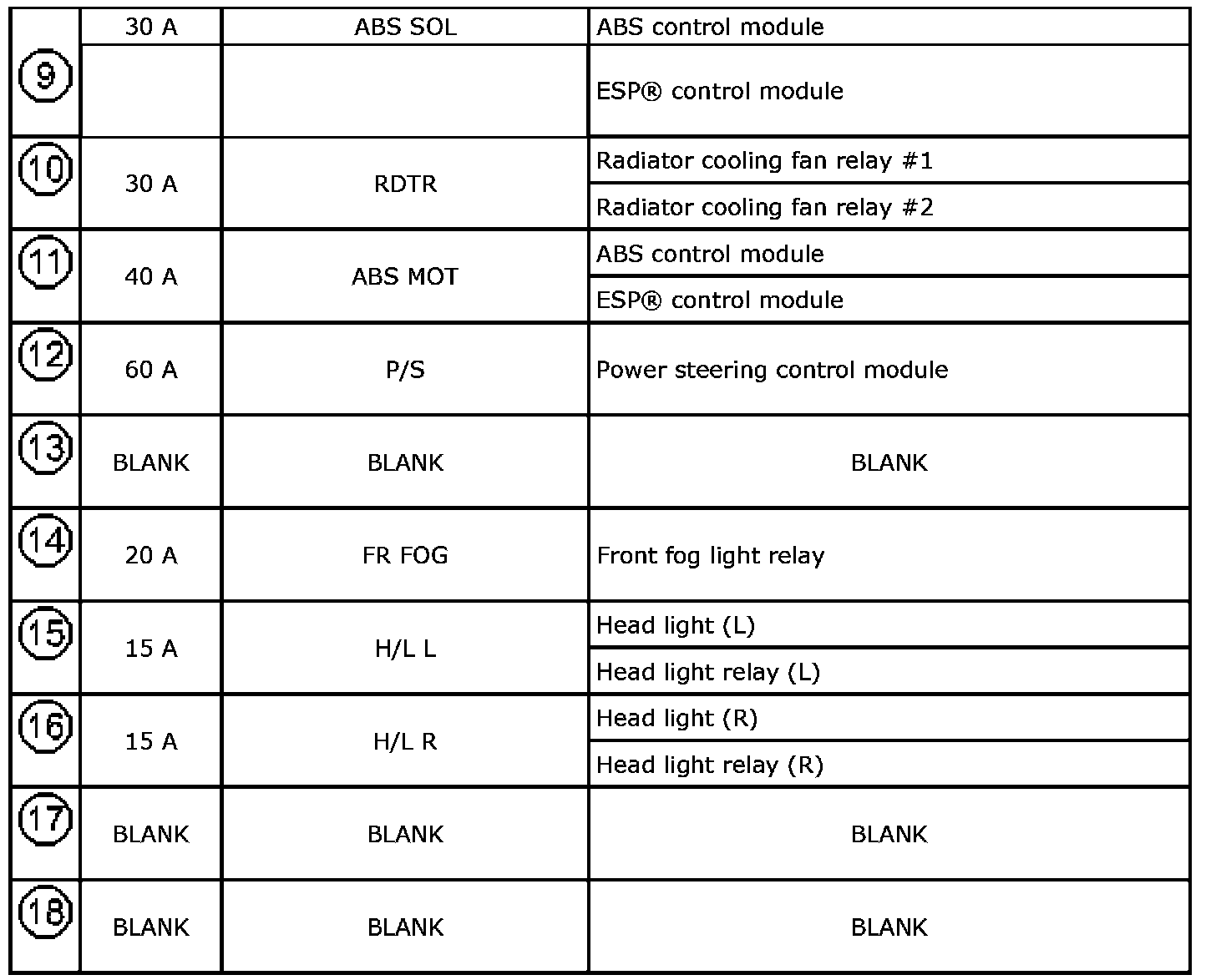 Fuse Box No.1 Application Table Fuse 9-Fuse 18: