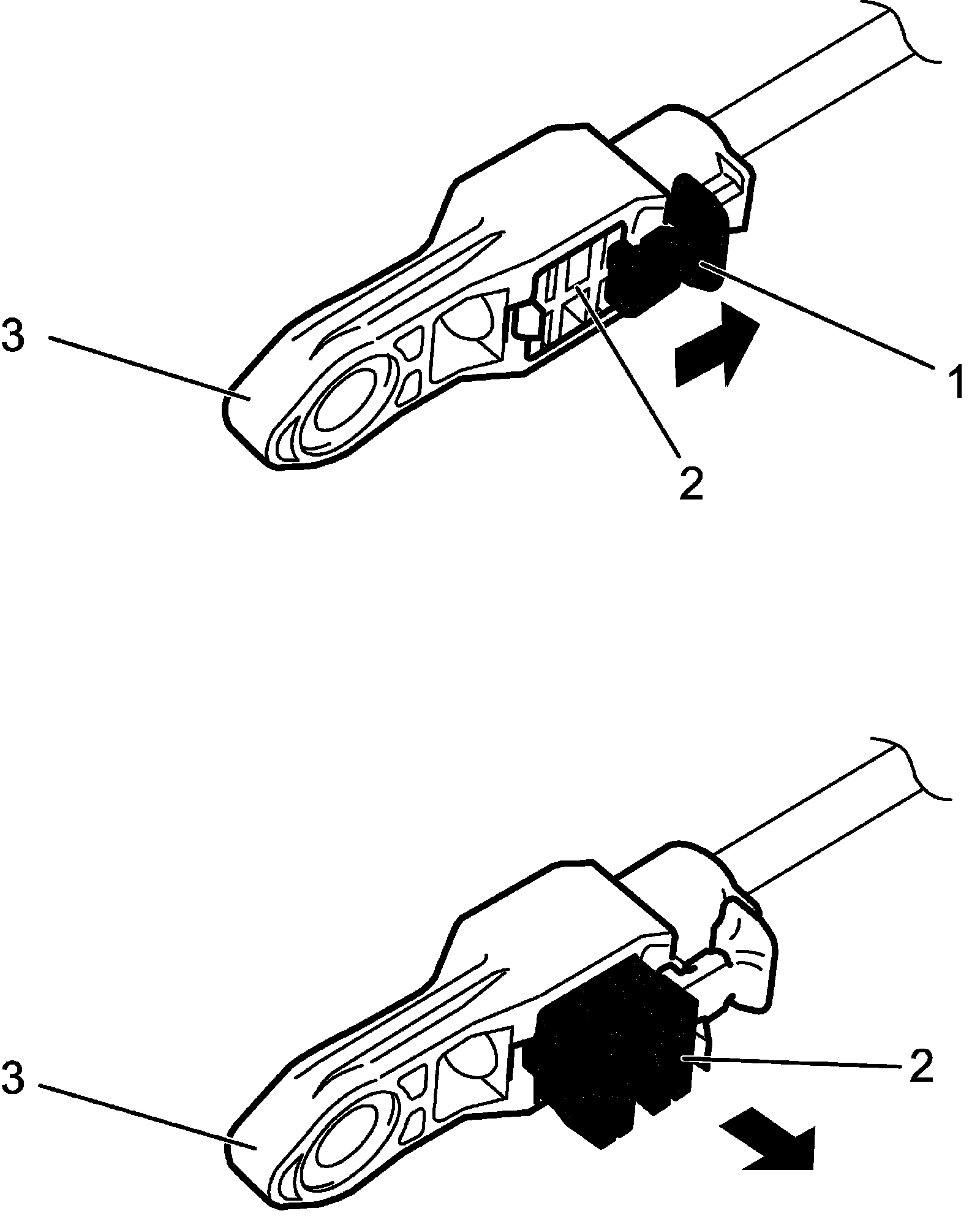 8) Pull out lock piece (2) from adjuster case (3) using such as a pliers to disengage cable.