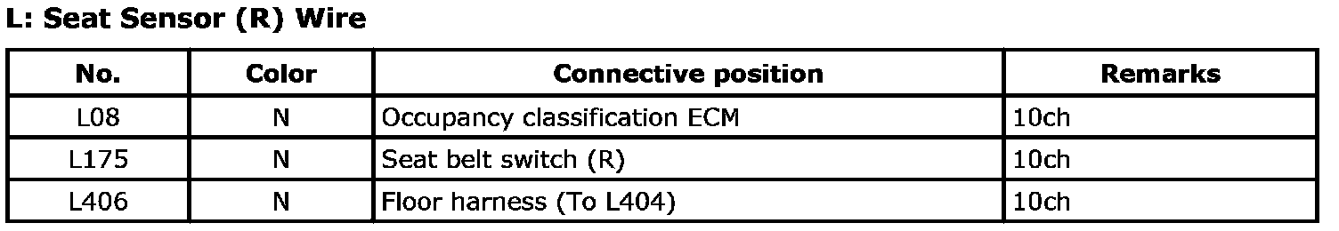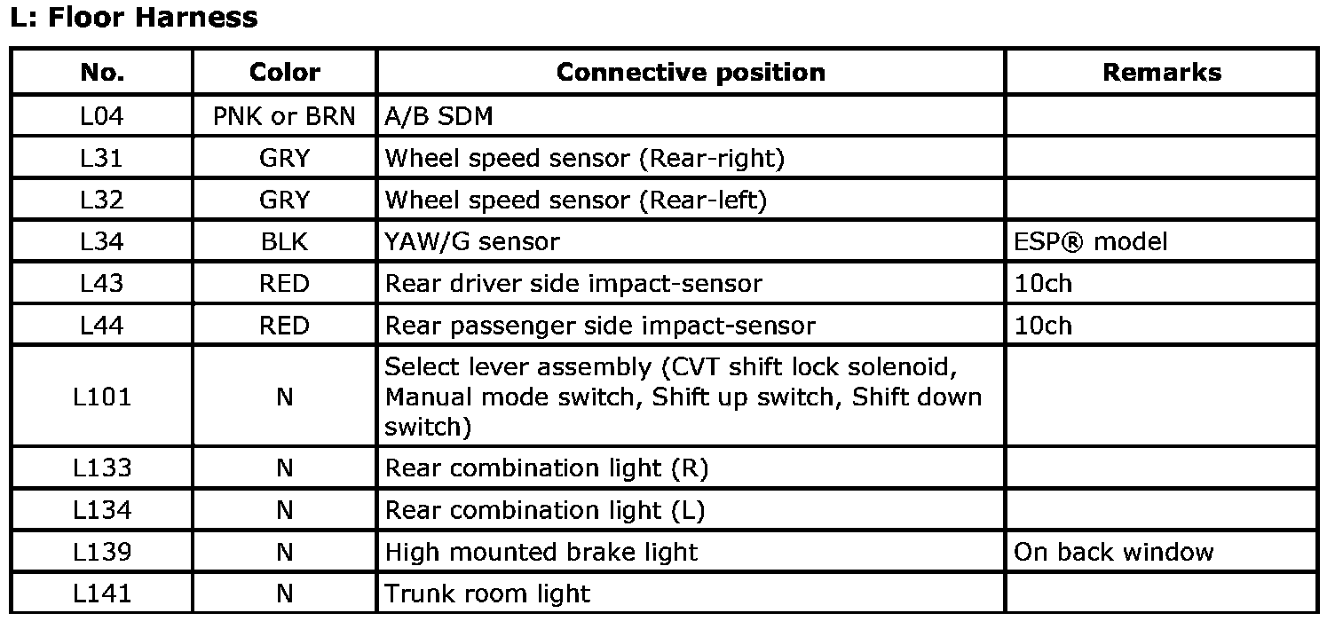 L: Floor Harness, Seat Sensor (R) Wire, Seat Sensor (L) Wire / M: Trunk Room Harness / Q: Side-Air Bag (Driver Side) Harness, Side-Air Bag (Passenger Side) Harness / R: Fuel Pump Wire (Sedan Model)L: Floor Harness, Seat Sensor (R) Wire, Seat Sensor (L) Wire / M: Trunk Room Harness / Q: Side-Air Bag (Driver Side) Harness, Side-Air Bag (Passenger Side) Harness / R: Fuel Pump Wire (Sedan Model):