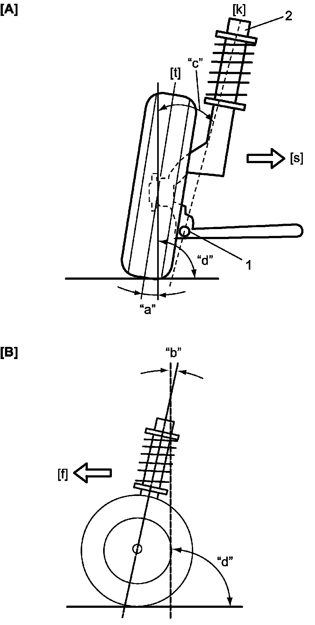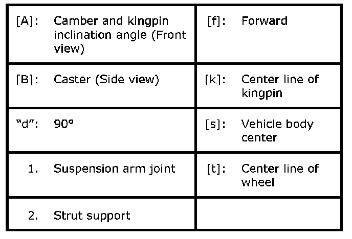 Camber Caster and Kingpin Inclination Angle InspectionCheck camber, caster and kingpin inclination angle by camber caster kingpin gauge (1) and turning radius gauge (2). If measured value is out of specified value, check following items for damage, deformation and crack. If any faulty condition is found, repair or replace defective item.