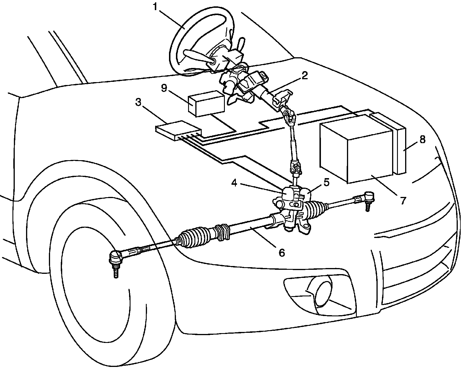 P/S System DescriptionThis electronic power steering (EPS) system consists of a power steering (P/S) control module (3), a torque sensor (4), a P/S motor (5). In this system, the P/S control module determines the level and direction of the assist force for the steering wheel (1) according to the signal from the torque sensor and the vehicle speed signal from BCM (9). The P/S control module runs the motor so as to assist the operation of the steering wheel.