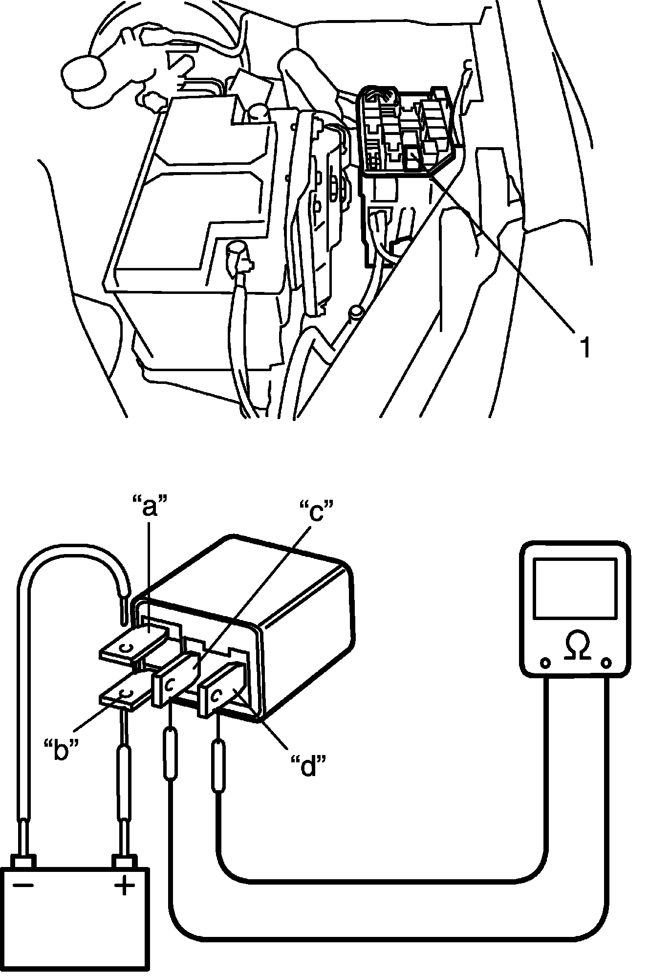 4) Connect battery positive (+) terminal to terminal "b" of relay. Connect battery negative (-) terminal to terminal "a" of relay. Check for continuity between terminal "c" and "d". If there is no continuity when relay is connected to the battery, replace CVT relay.