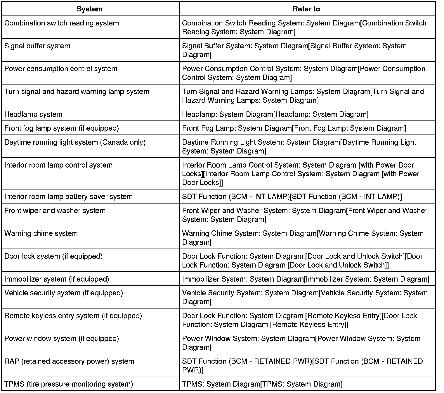 - BCM has combination switch reading function for reading the operation status of combination switches (light, turn signal, wiper and washer) in addition to a function for controlling the operation of various electrical components. It also has the signal transmission function as the passed point of signal and the power consumption control function that reduces the power consumption with the ignition switch OFF.