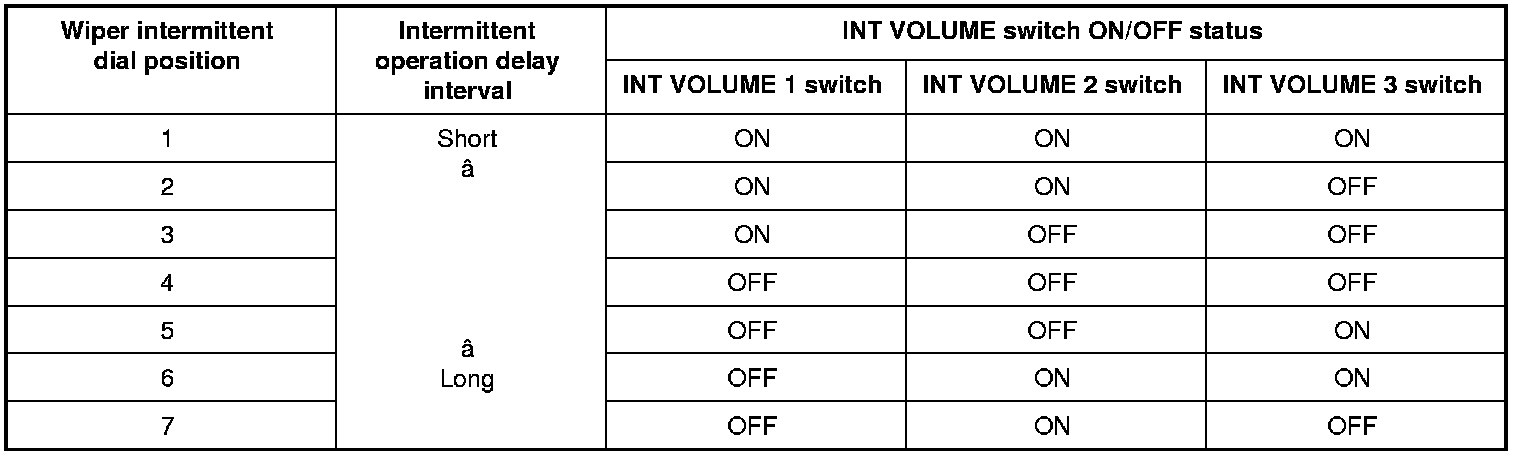BCM judges the wiper intermittent dial 1 - 7 by the status of INT VOLUME 1, 2 and 3 switches.
