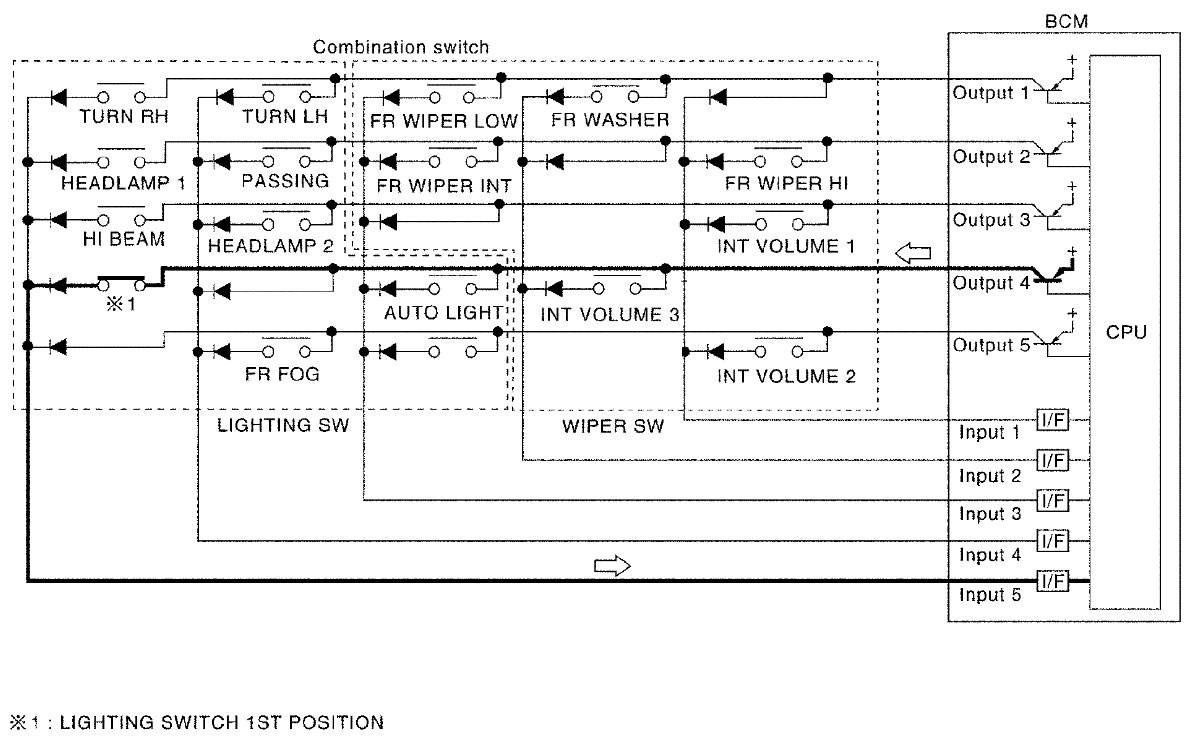 - BCM detects the combination switch status signal "1CE" when the signals of OUTPUT 3 and OUTPUT 5 are input to INPUT 1.