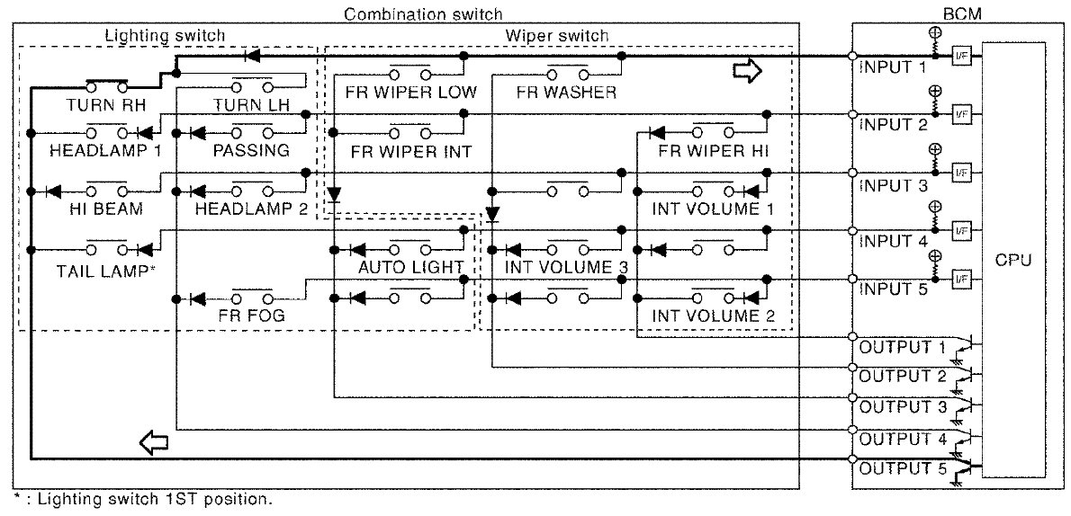 - BCM reads the status of the combination switch (light, turn signal, wiper and washer) and recognizes the status of each switch.
