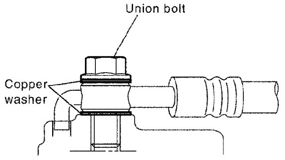 2) Remove the union bolt then disconnect the brake hose and discard the copper washers.