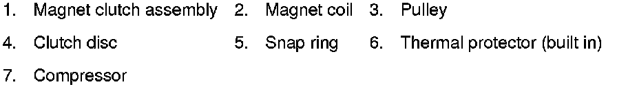 When replacing compressor clutch assembly, always conduct the break-in operation. This is done by engaging and disengaging the clutch about 30 times. Break-in operation raises the level of transmitted torque.