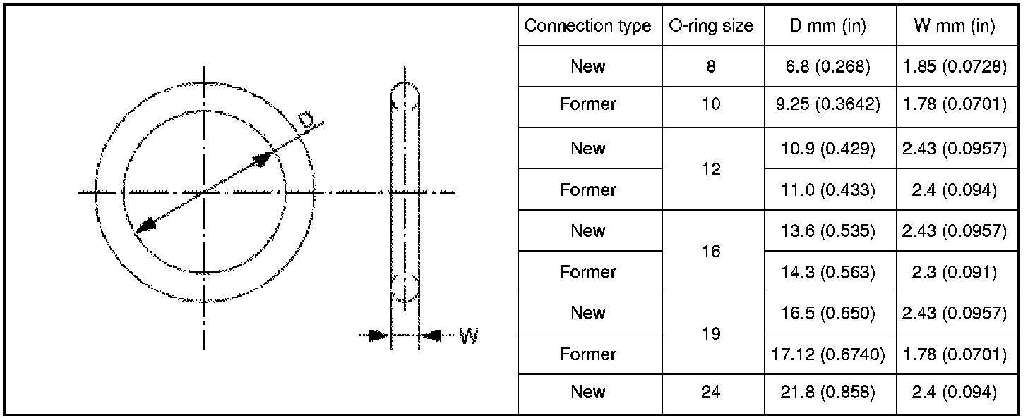 - The O-ring has been relocated. It has also been provided with a groove for proper installation. This reduces the possibility of the O-ring being caught in, or damaged by, the mating part. The sealing direction of the O-ring is now set vertically in relation to the contacting surface of the mating part to improve sealing characteristics.