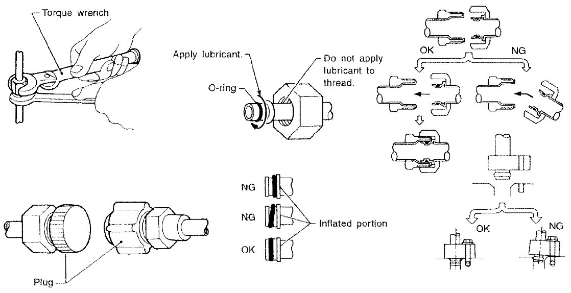 - After connecting line, conduct leak test and make sure that there is no leakage from connections. When the refrigerant leaking point is found, disconnect that line and replace the O-ring. Then tighten connections of seal seat to the specified torque.