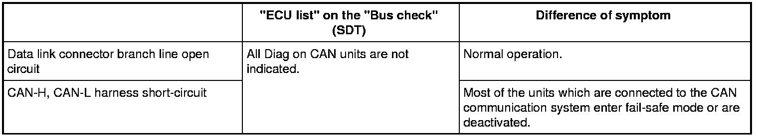 - When data link connector branch line is open, "ECU list" displayed on the SDT "Bus check" may be the same as when the CAN communication line has short-circuit. However, symptoms differ depending on the case. See below chart for the differences.