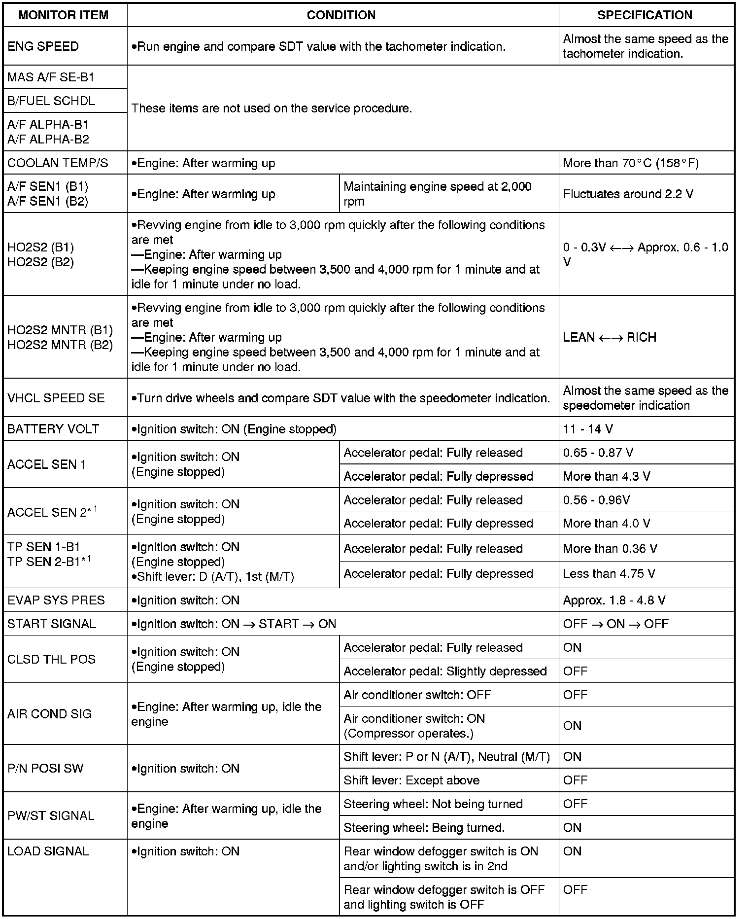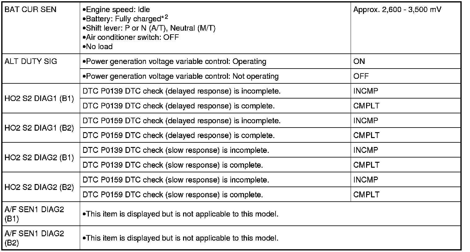 *1: Accelerator pedal position sensor 2 signal and throttle position sensor 2 signal are converted by ECM internally. Thus, they differ from ECM terminals voltage signal.