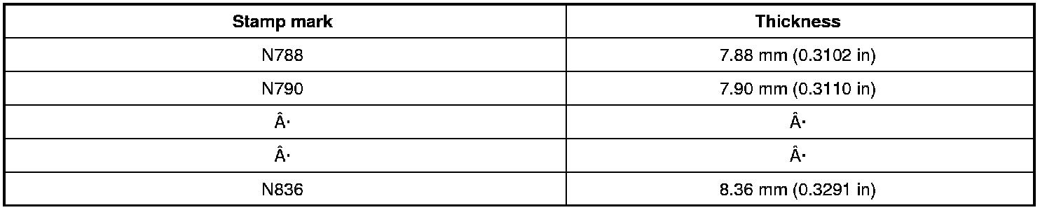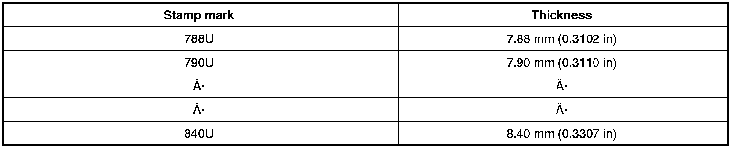 Available thickness of valve lifter: 25 sizes with range 7.88 to 8.36 mm (0.3102 to 0.3291 in) in steps of 0.02 mm (0.0008 in) (when manufactured at factory). Refer to [Service Data and Specifications] [1][2]Specifications.