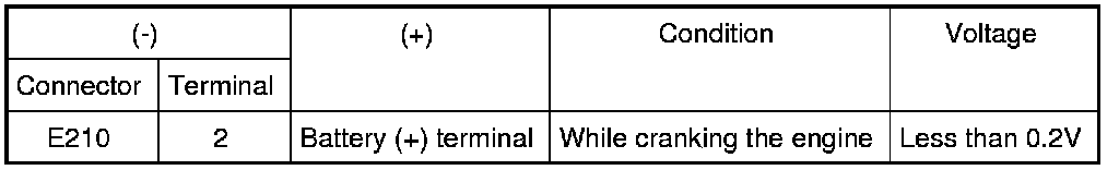 3 Check voltage between battery positive terminal and starter motor connector E210 terminal 2 while cranking the engine.