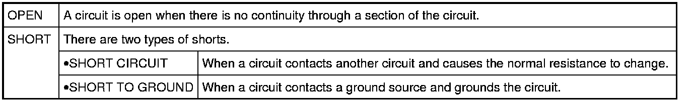 The continuity check is used to find an open in the circuit. The digital multimeter (DMM) set on the resistance function will indicate an open circuit as over limit (no beep tone or no ohms symbol). Make sure to always start with the DMM at the highest resistance level.