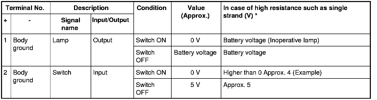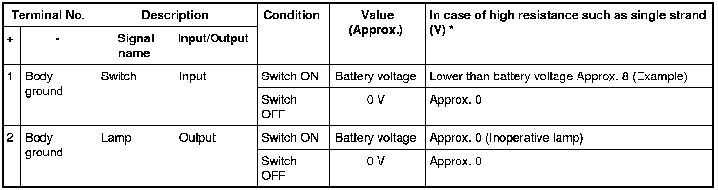 - *: If high resistance exists in the switch side circuit (caused by a single strand), terminal 2 does not detect approx. 0 V. Control unit does not detect the switch is ON even if the switch does not turn ON. Therefore, the control unit does not control ground to light up the lamp.