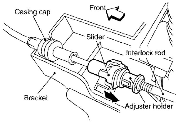 5) Remove casing cap from bracket of shift selector assembly and remove interlock rod from adjuster holder.