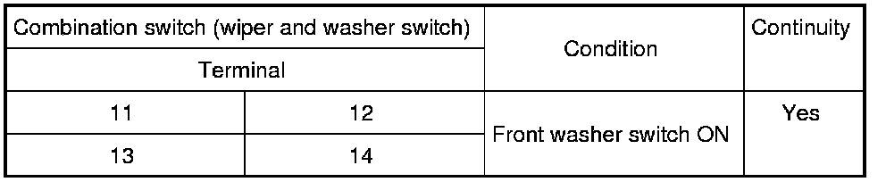 3 Check continuity between the combination switch (wiper and washer switch) terminals.