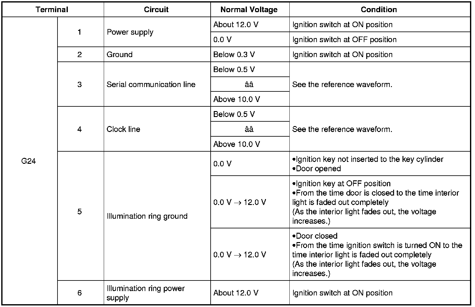 As each terminal voltage is affected by the battery voltage, confirm that it is 11 V or more when the ignition switch is turned to ON position.