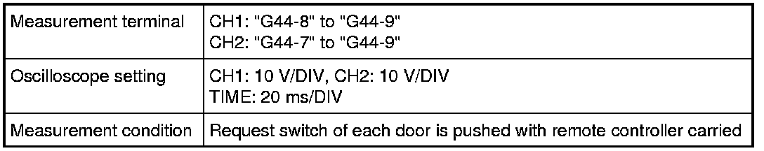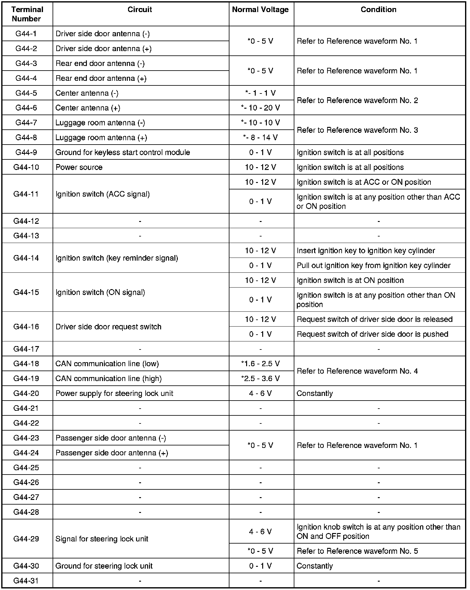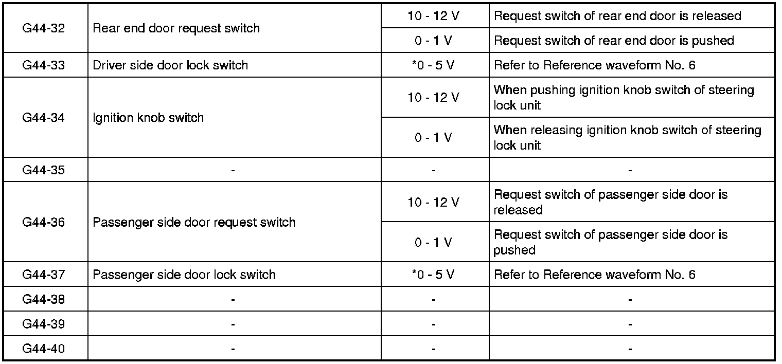- As each terminal voltage is affected by the battery voltage, confirm that it is 11 V or more when ignition switch is ON.