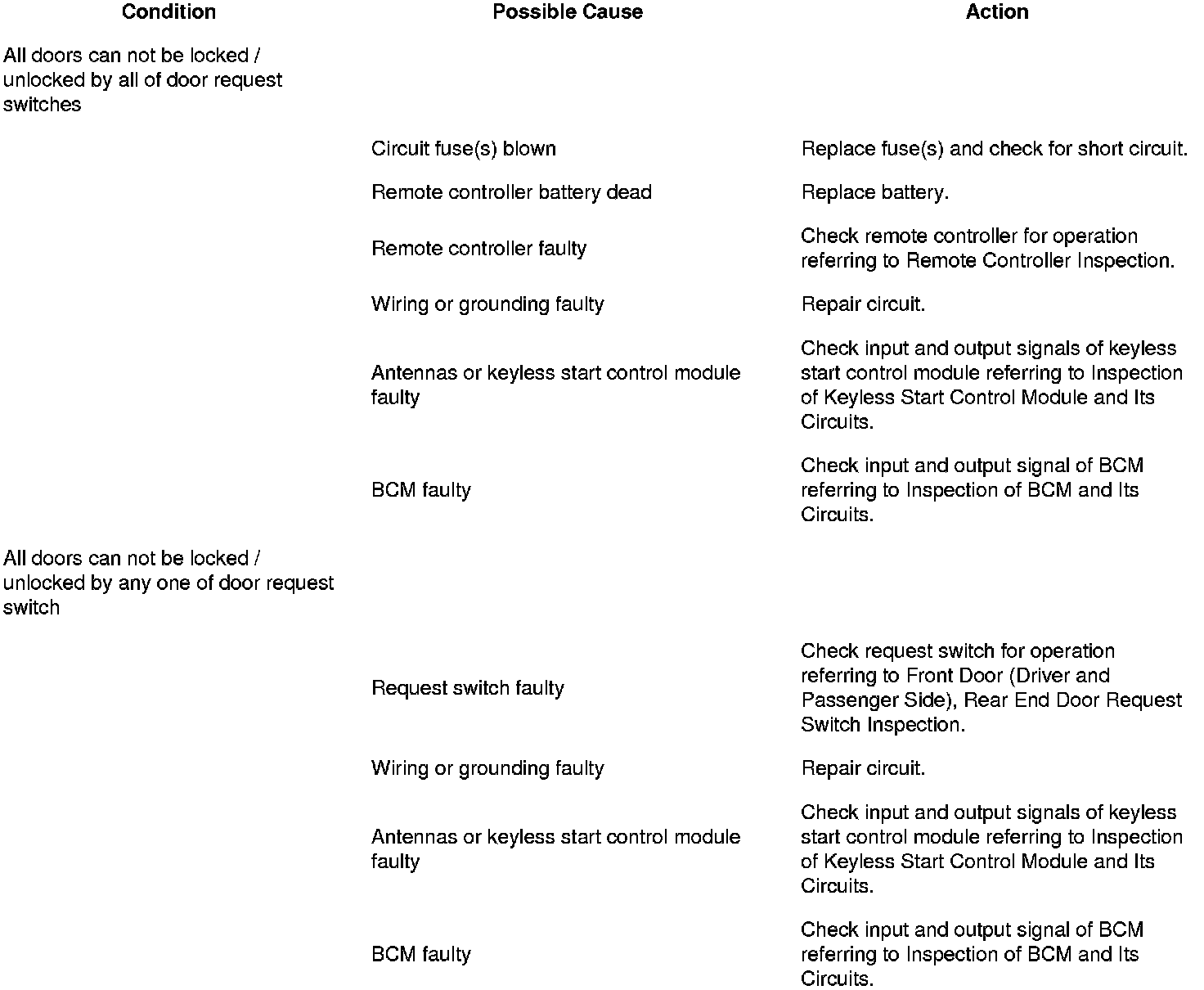 Before performing trouble diagnosis procedure for door lock function of keyless start system, check that power door lock system operates properly referring to Power Door Lock System Operation Inspection Power Door Lock System Operation Inspection. If power door lock system does not operate properly, go to Power Door Lock System Symptom Diagnosis Power Door Lock System Symptom Diagnosis.