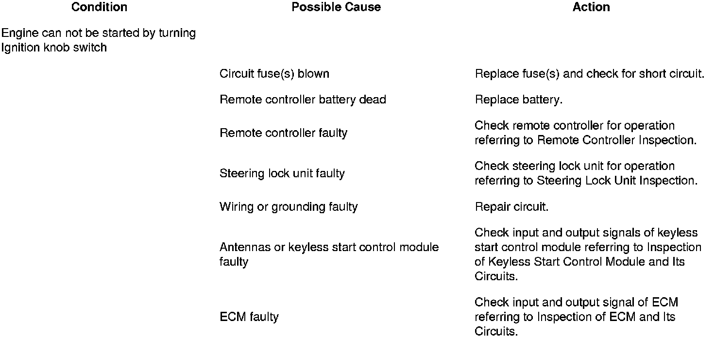 Before performing symptom diagnosis procedure for keyless engine start system, check that engine starts by using ignition key. If it cannot be started by using ignition key, go to Engine Symptom Diagnosis Engine Symptom Diagnosis.