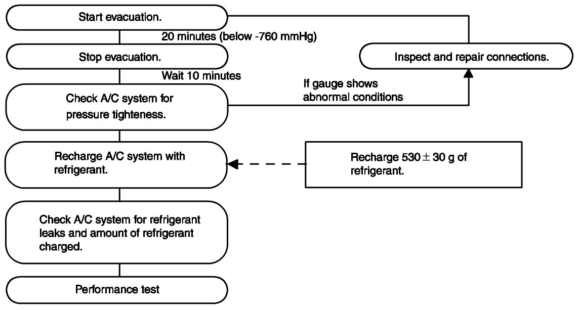 - Since the A/C system has no sight glass, first recover refrigerant and evacuate the system, and then fill the system with the specified amount of refrigerant.