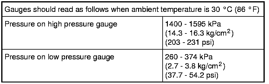 8) After the system has been charged with specified amount (530 ± 30 g) of refrigerant or when low pressure gauge and high pressure gauge have indicated the following specified value, close low pressure side valve on manifold gauge set.