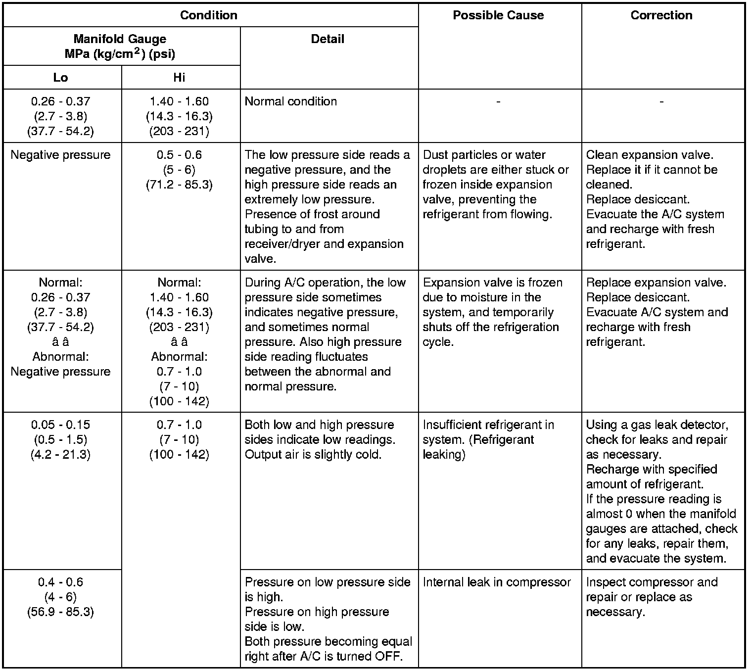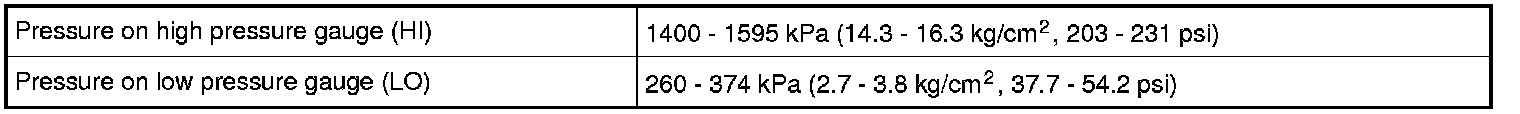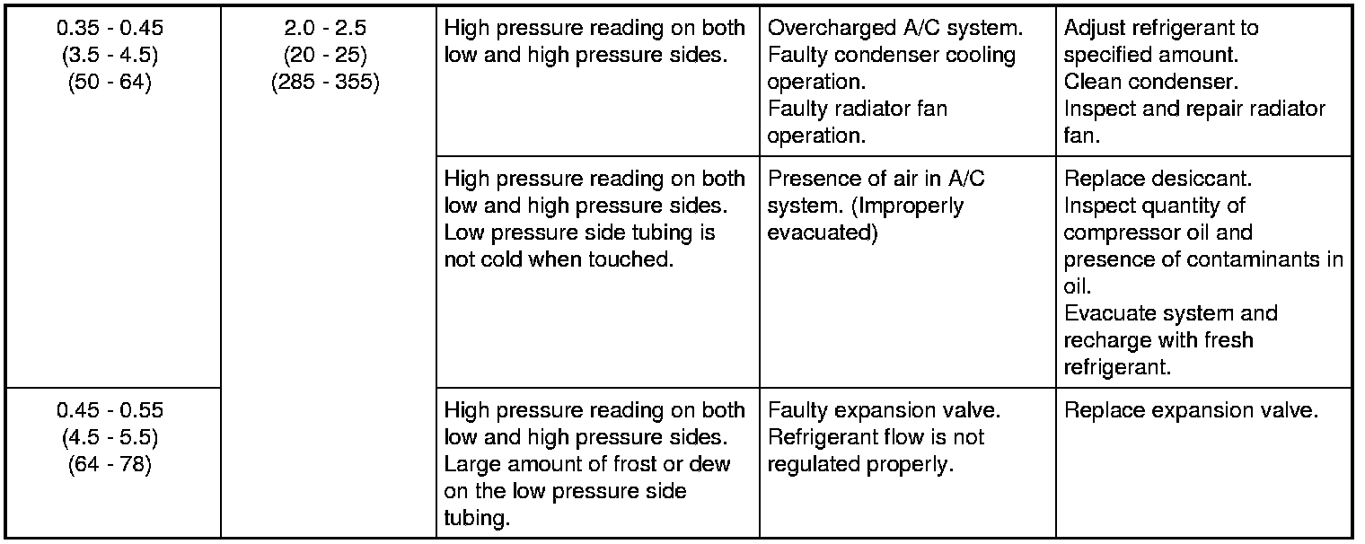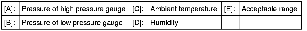 If ambient temperature is approximately 30 °C (86 °F), it is possible to diagnose A/C system in detail referring to the following table.