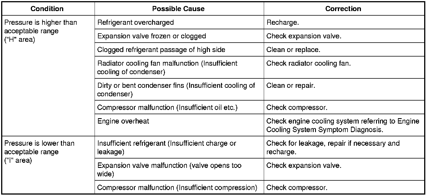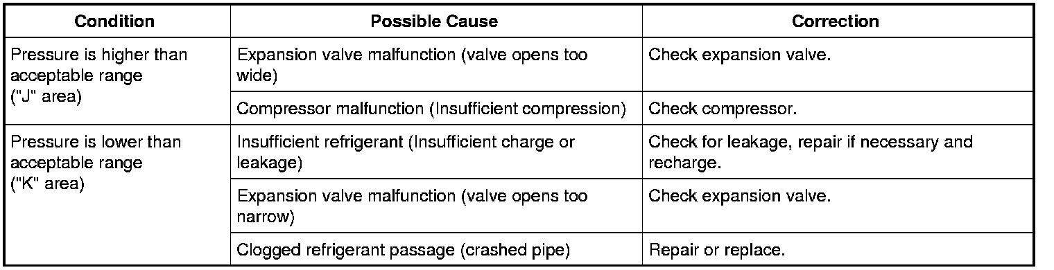 10) Check for each pressure of low side and high side if it is within shaded range of graph. If each gauge reading is out of specified pressure, correct defective part referring to the table.