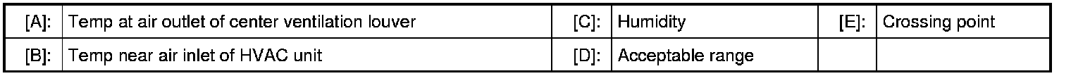 For example, if A/C evaporator inlet port temperature is 30 °C (86 °F) and center ventilation louver temperature is 14 °C (57.2 °F), their crossing point is within acceptable range as shown in the graph in this case, cooling performance is satisfactory and proper.