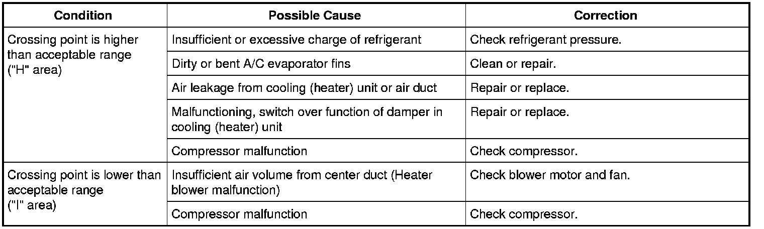 12) If crossing point is out of acceptable range, diagnose trouble referring to the following table.