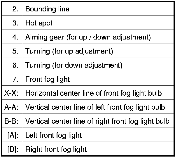 - Unless otherwise obligated by local regulations, adjust front fog light aiming according to the following procedure.