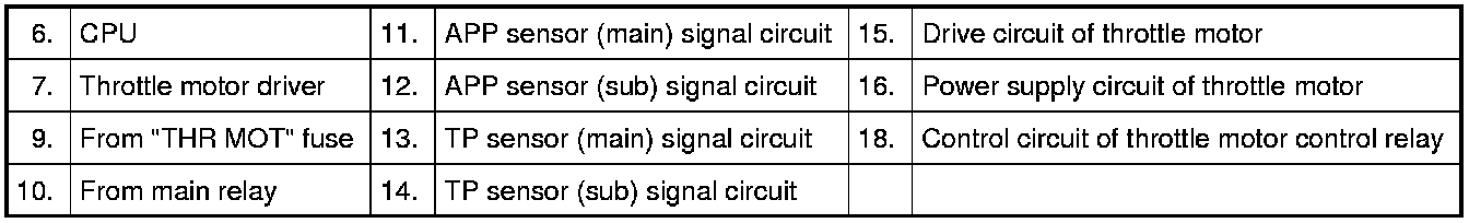In this system, TP sensor and APP sensor have 2 sensors (main and sub) each to assure highly accurate and highly reliable control and abnormality detection. Also, when ECM detects an abnormality in the system, it turns off the throttle motor control relay (8) to stop controlling the throttle motor. When the throttle motor control relay is turned off, the throttle valve is fixed at the opening of about 7° (default opening) from its completely closed position by the balance of the return spring and open spring in the throttle body.